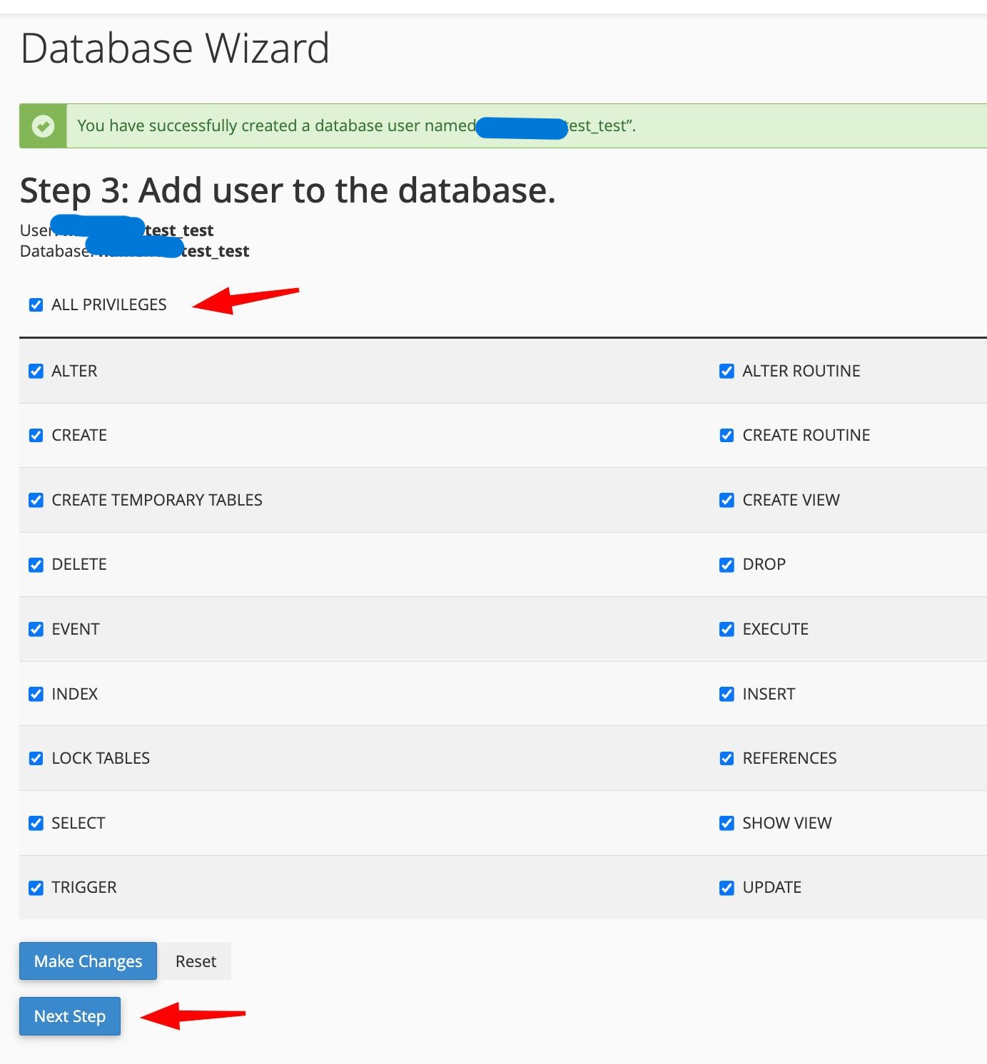 STEP 5: Give the user permissions. Generally All Privileges works well for most. But if you have unique uses for this database and user, select what permissions you would like to give them.